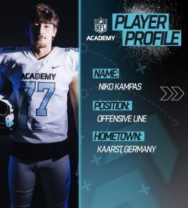 Heute profitiert Kampas von genau dieser frühen Prägung. Sein Verständnis für das Spiel, seine körperlichen Voraussetzungen und seine Disziplin machen ihn zu einem der spannendsten Offensive-Line-Talente Europas. In England, wo er aktuell trainiert, erlebt er ein Umfeld, das sich fundamental von der deutschen Football-Realität unterscheidet: strukturierte Programme, tägliche Einheiten und eine klare Ausrichtung auf Leistungssport.